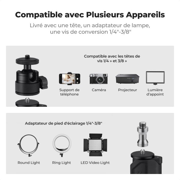 • Le dessus du support est équipé d'une vis 1/4″ et d'une rotule filetée 1/4″, vous permettant de fixer tout appareil doté d'un port fileté 1/4″, comme des lampes LED de poche, des pinces pour téléphone, des webcams ou des appareils photo. Il comprend également un adaptateur de pied d'éclairage 1/4″ à 3/8″, facilitant la fixation d'anneaux lumineux plus grands ou de panneaux LED pour répondre à divers besoins de prise de vue.