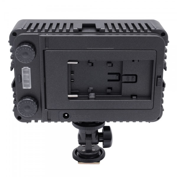 Ce panneau à LED est compatible avec plusieurs types de batterie : CANON LP-E6, NIKON EN-EL15, PANASONIC D16, SONY NP-F550 / 750/970 et il est possible de le faire fonctionner avec 6 piles AA.