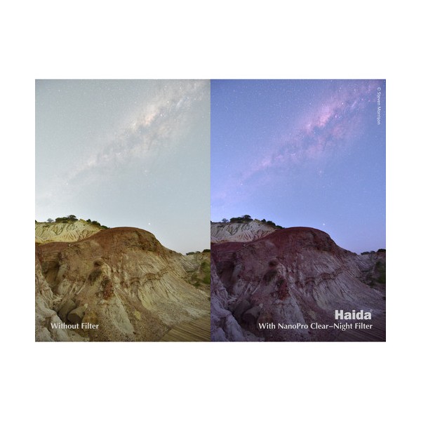 Le filtre NanoPro MC Clear-Night 82 mm de Haida est conçu pour réduire l'apparence de la pollution lumineuse dans les images ou les vidéos qui incluent le ciel nocturne, et pour minimiser l'éclairage provenant de sources de lumière artificielle.
