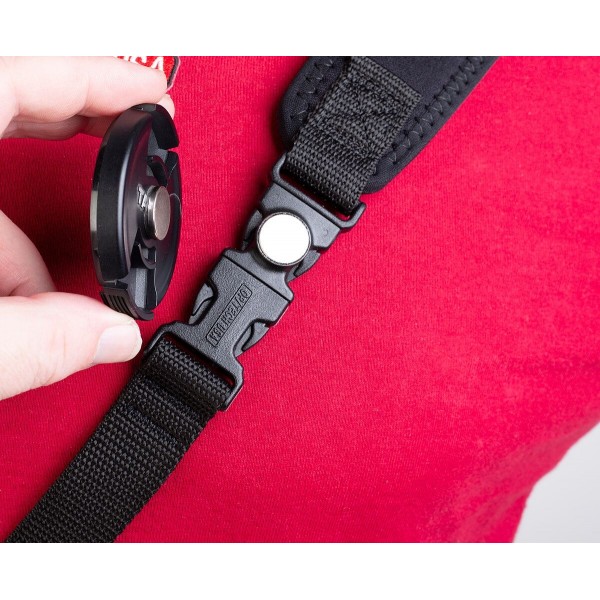 Le Magnetic QD se fixe facilement aux sangles et harnais OP/TECH USA via une déconnexion rapide robuste. Grâce à son puissant aimant, il maintient solidement bouchons d’objectif, loupes, viseurs ou petits flashs, même avec des gants.